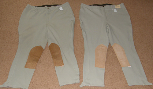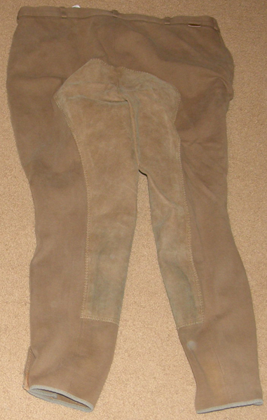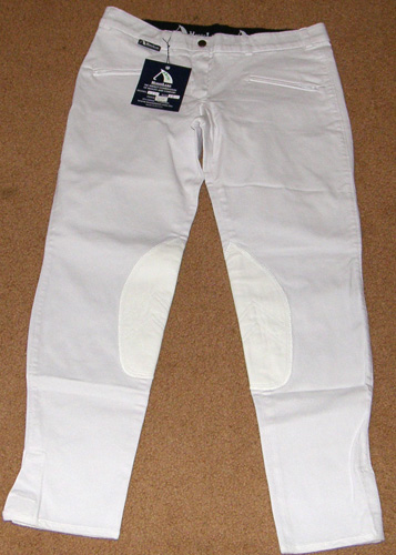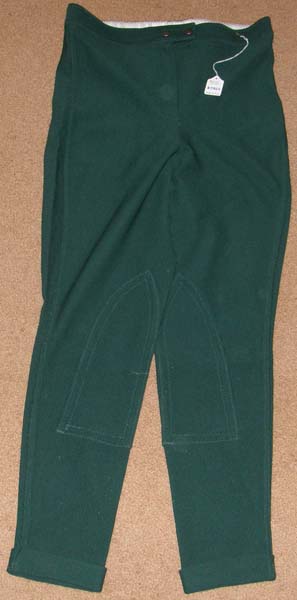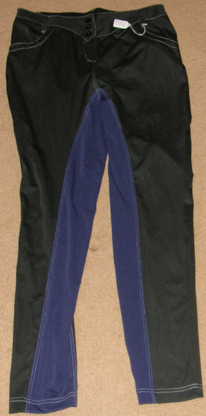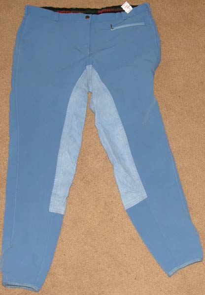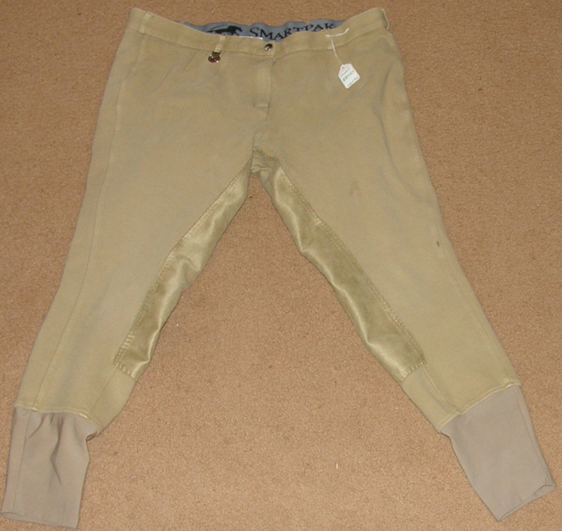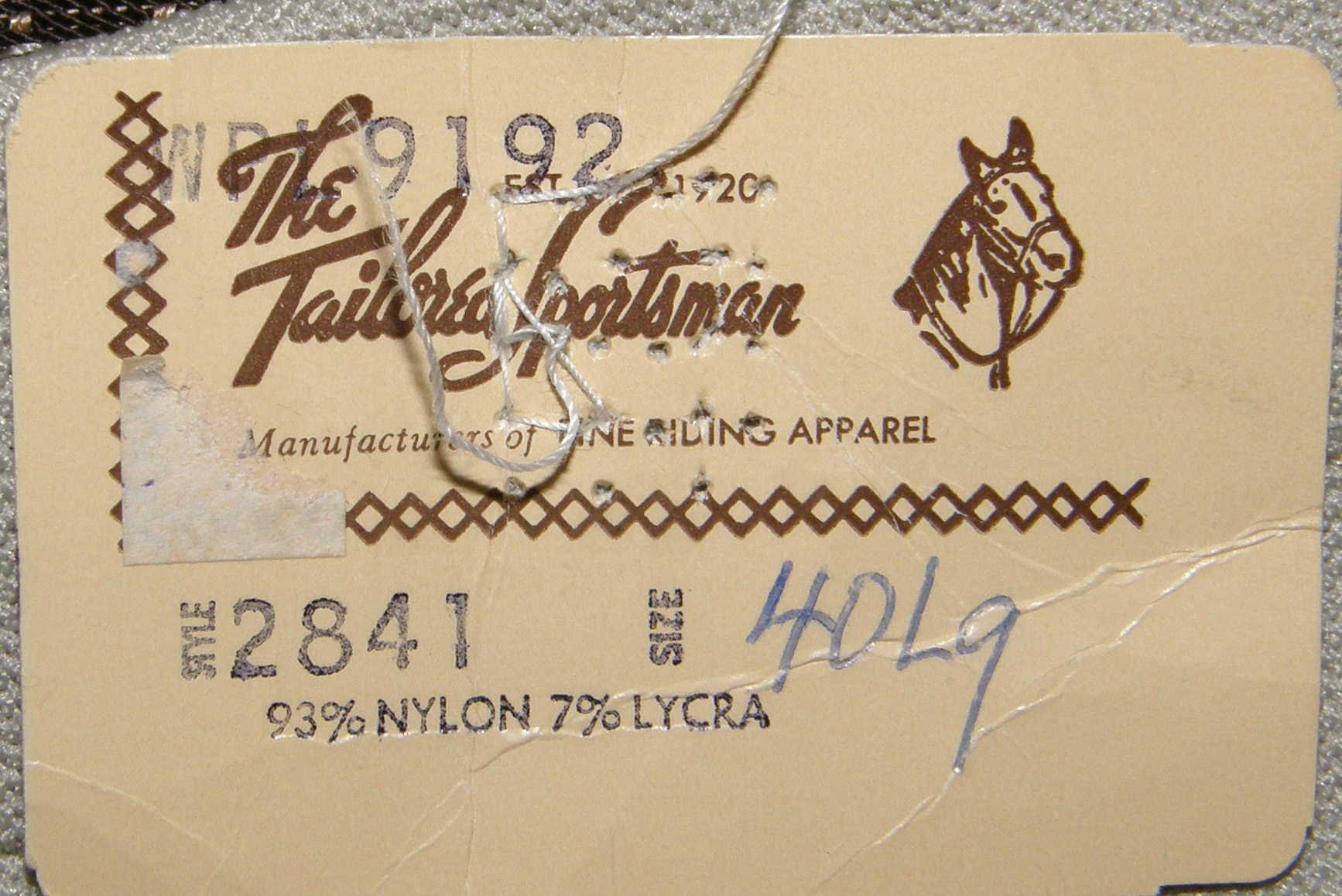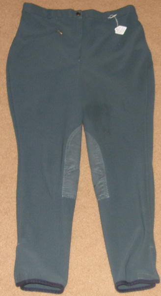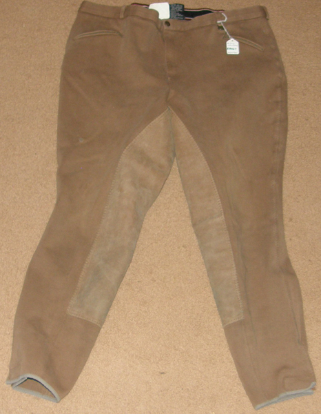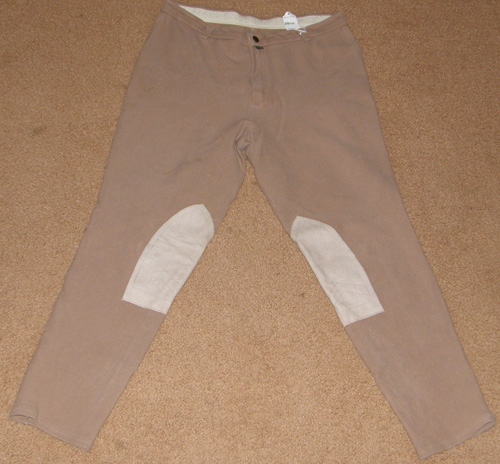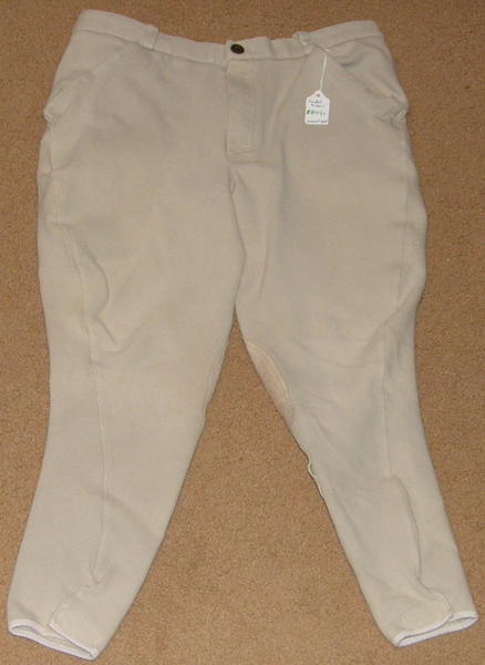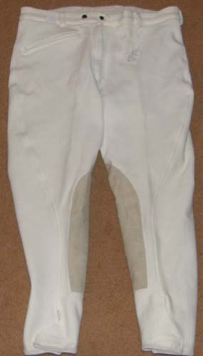 90% cotton/10% Lycra front zip style breeches with wide no roll elastic lined waist, belt loops, zippered slash front pocket, no inside leg seams, Clarino full seat & leg patches, & Velcro ankle enclosures. Machine wash. Tagged size 40 Long(Ladies), it measures unstretched 40" at waist & has a 26 1/2" inseam. Excellent used condition with some light stains from boot tops.