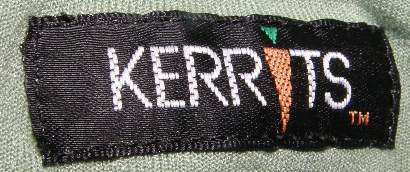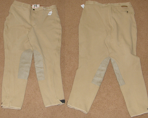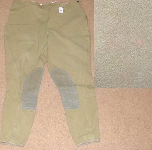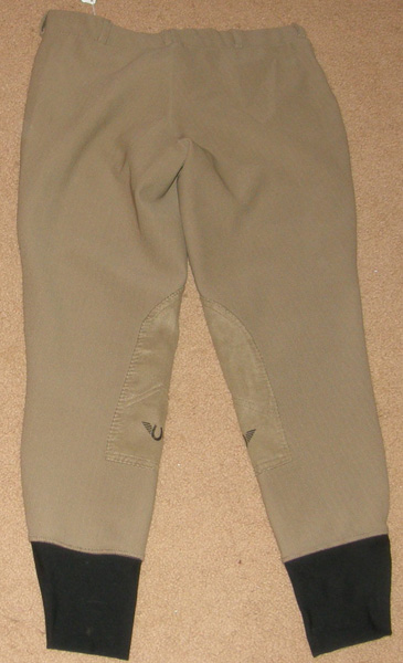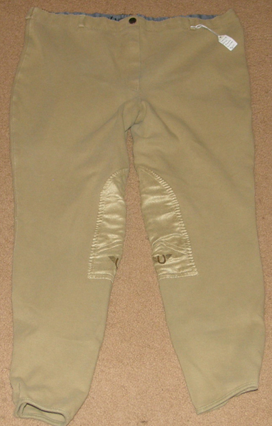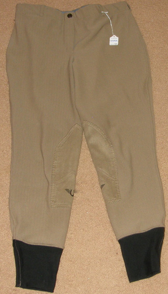 92% cotton/8% Lycra pull on style breeches with wide elastic lined waist, belt loops, fake front zipper, small inside treat pocket, no inside leg seams, knee patches with a winged horseshoe logo, & Velcro ankle enclosures. Machine wash. Tagged size 40(Ladies), it measures unstretched 40" at waist & has a 26" inseam. Tagged Lt Tan, this looks more Khaki to us. Good used condition with some fabric pilling throughout, very light staining in seat & elastic in waist is shot so will need to use belt loops.