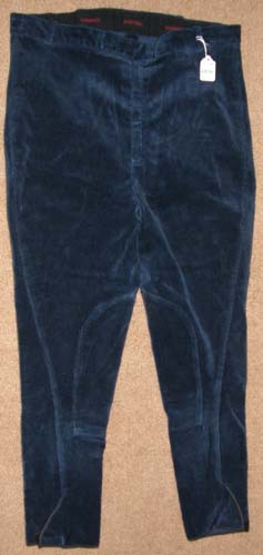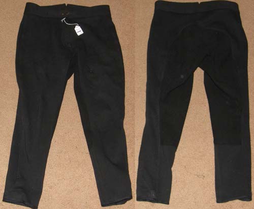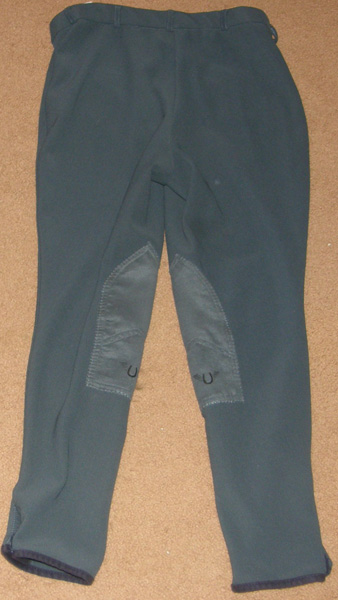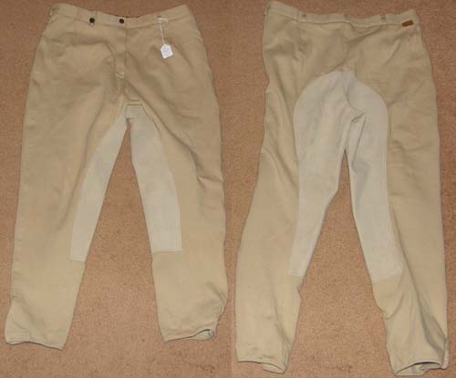 Cotton/lycra blend zip front style breeches with elastic lined waistband with belt loops, 1 back zippered pocket, Clarino knee patches, & velcro at ankles. Tagged size 34R, it measures unstretched 32" at waist & has a 23" inseam, so may have shrunk with laundering. Usually a rear pocket is for Mens breeches, but owner was female, so don't know if these are Mens or Ladies breeches. Excellent used condition with no stains or spots that we can see.