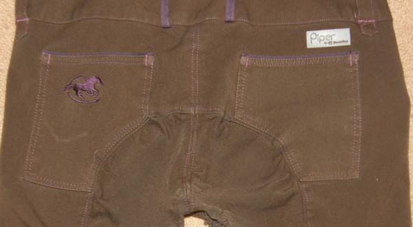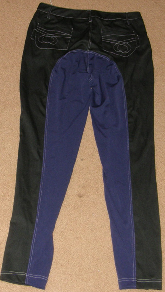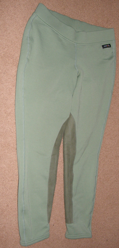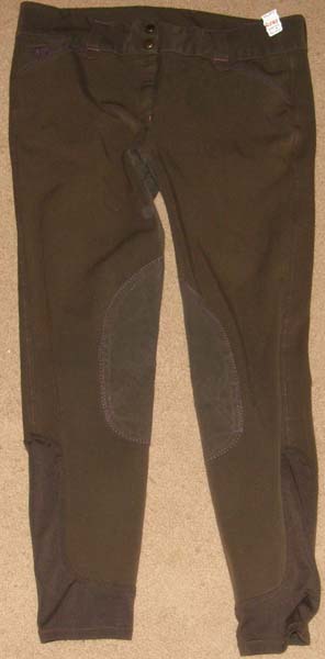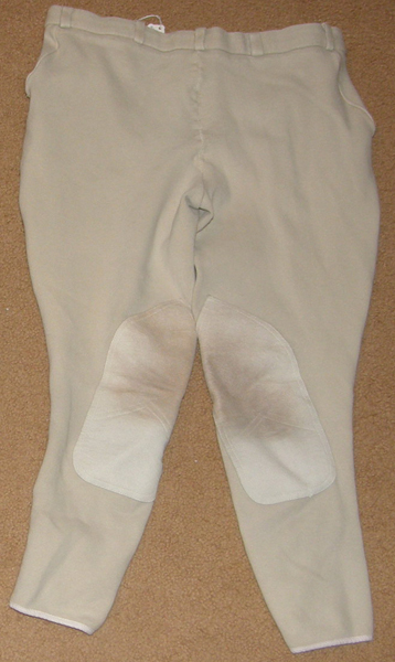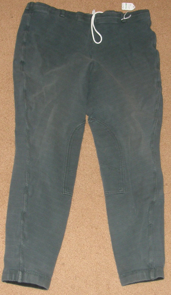 Pull on style breeches with elastic waistband, small inside treat pocket, & same fabric knee patches. 97% cotton/3% Spandex. Super soft comfortable breeches for everyday riders. Tagged size XL 36-38(Ladies), it measures unstretched 31" at waist & has a 25" inseam, so may have shrunk with laundering. Excellent used condition with some fabric pilling to high friction areas.
