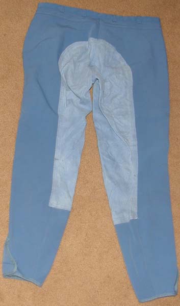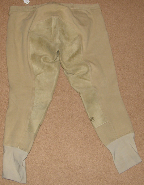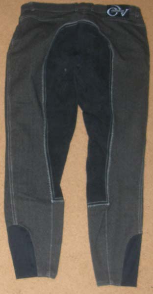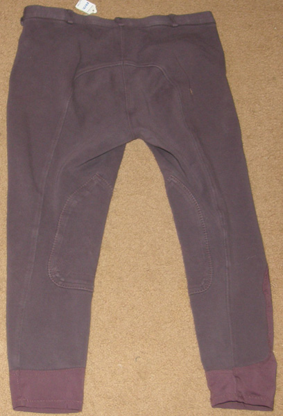 Front zip style breeches with elastic lined waistband with belt loops, Clarino knee patches, Velcro at ankles & no seams on inside of legs. 95% cotton/5% spandex. Tagged size 34 Long(Ladies) it measures unstretched almost 32” at waist & has a 26 1/2” inseam, so may have shrunk with laundering. Minor spots/stains, some fabric pilling in high friction areas & elastic waist is losing its stretch. One Velcro strip on bottom of leg is fraying & coming off.
