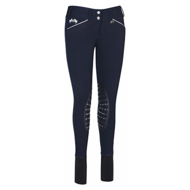 Lightweight cotton zip front style breeches with elastic lined waistband with belt loops, 2 zippered slash front pockets, Clarino knee patches, & Velcro at ankles. 97% cotton/3% spandex. These tend to run a little small, i.e. they measure unstretched approx 33" at waist with a 27" inseam & with the high cotton content will probably shrink with washing, so we recommend buying these breeches at least a size larger than needed.