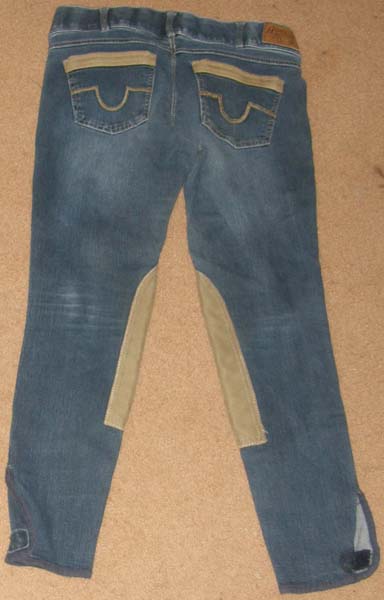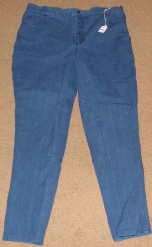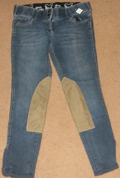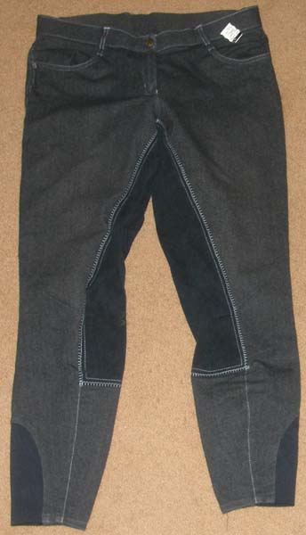 Zip front stretch denim 5 pocket riding jeans with waistband with belt loops, same fabric knee patches, & hemmed at ankles. 68% cotton/25% polyester/7% Lycra. Tagged size 36 Standard(Ladies), it measures unstretched 36" at waist & has a 29" inseam. New, no tags.
