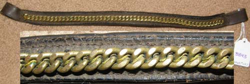Super quality butter soft leather English browband with brass herringbone chain in center. Flows in your hands! Dress up your bridle with some bling. Browband measures approx 15” long x 5/8" thick x 3/4" wide. Brand unknown. Some green marks on brass chain.