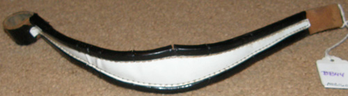 Shaped patent leather browband for gaited breeds. Measures 15” long & tapers from 1 5/8" wide to 7/8" wide. Minor cracks on edging, 1 side cracked where it joins crown & other side is missing black vinyl completely.