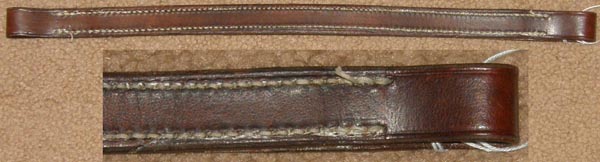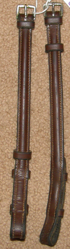 5/8” wide quality leather doubled & stitched with contrast stitching round raised cheek piece for English bridles. Has hook stud end, scored & darkened edges, & measures 10 3/4” long with all keepers. 1 cheek is 11 1/4" which is 1/2" longer than other so probably stretched. Brand unknown, but leather is supple. 1 pair available.