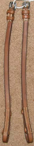 1/2” wide leather cheek pieces for English bridles. Measures 11” long, has hook stud ends, scored & darkened edges, & has all keepers. Buckle is stainless steel. Brand unknown. Surface cracks when tightly bent, otherwise supple. 1 available.