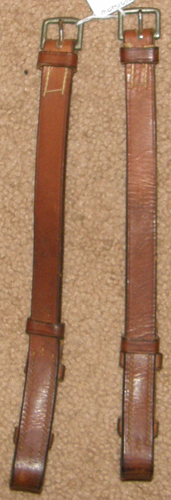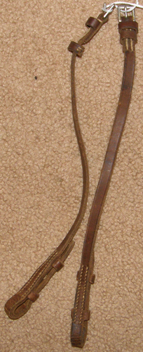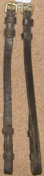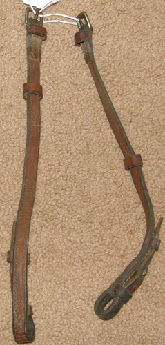 1/2” wide flat leather cheek pieces with scored edges for English bridles. Measures 11” long with hook & stud ends, & has all keepers. Light surface cracking mainly at bit end, but leather is supple. Sold individually, 2 available.