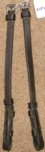 1/2” wide leather cheek pieces for English bridles. Measures 11” long, has hook stud ends, brass buckles, scored & darkened edges, & has all keepers. Brand unknown, probably imported, with lots of wrinkles in hide that look like cracks but are not. Sold as a pair.