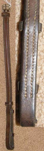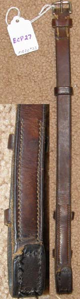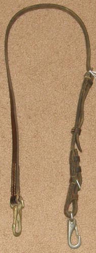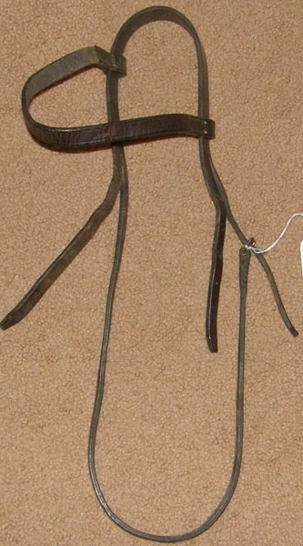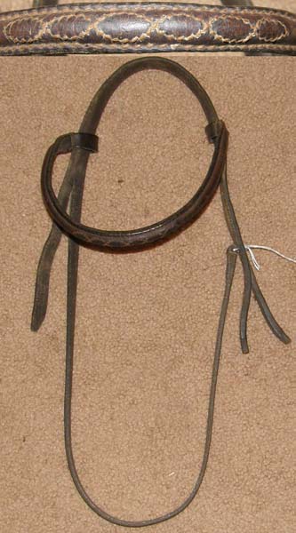 Leather piece that runs up and around the crown and attaches to the bradoon snaffle bit to create a double bridle. Also known as Weymouth converter, bradoon slip, or bit hanger, it converts a regular English bridle into Weymouth/Double Bridle. These are also good to use when starting young horses wearing a bit(English or Western) as they are easy to slip under a halter without undoing any buckles & are great for lunging. 1/2” wide dark brown leather with white stitching & spring snaps at bit ends. Has English style buckle at 1 end so snap can be replaced or removed & headstall adjusts on 1 side only. Measures 41 1/2” at largest & 32" at smallest adjustment. Brand unknown. Leather is sturdy yet supple.