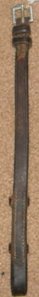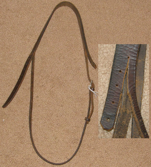 5/8” wide leather cheek piece for English bridles. Measures 11 1/4” long, has hook stud end, rubbed & darkened edges, & has all keepers. 1 only. Some wear to bit end, but still usable. Brand unknown.
