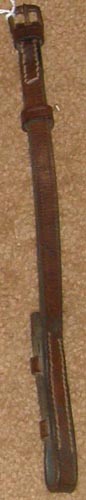 1/2” wide leather cheek piece for English bridles. Measures 10 1/2” long, has hook stud end, & has all keepers. 1 only. Some wear to bit end, but still usable. Brand unknown.