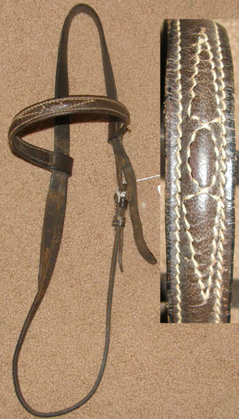Flat leather brow band 3/4” wide with raised white stitching. Measures 15 1/2” long. Maker unknown, but nice, soft, supple, not cheap leather. Could go either English or Western.