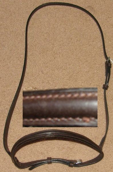 English caveson with round raised center approx 5/8" wide, has fancy stitching in center, & scored, rubbed & darkened edges. Noseband measures 25" at smallest & 28 1/2" at largest adjustment. Brand unknown, but leather is supple & good quality. Light dirt on side facing horse.