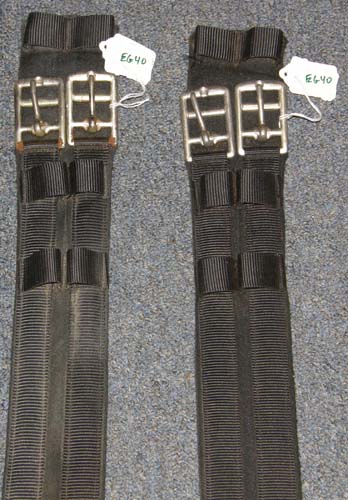 Soft synthetic English or Dressage girth with elastic at one end, 3 sets or guides/billet keepers on each side to keep straps neat. Just cleaned, minor hair on underside, some fabric pilling, otherwise excellent used condition. Measures approx 3" wide & 32" long including extended area to prevent pinching.