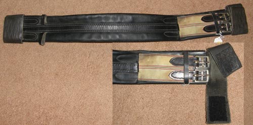 Top quality leather English girth with pinch guards with overlapping leather flaps that close with touch tape(Velcro) closure at both ends. For long billet saddles. Slightly padded with leather overlay in the center, elastic at 1 end, extra billet strap keepers on other end. Stamped 30, it does measure 30” & is approx 3 1/2" wide. Brand unknown, but this is a quality girth! Light staining on elastic ends.