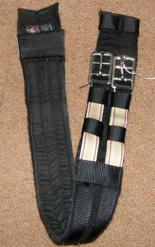 Easy care dressage girth the is comfortable for the horse. Machine washable. 3 sets of keepers on each end keep billets tidy. Just cleaned, but buckles have some rust. Measures approx 2 3/4" wide & is 30 1/2" long including extended area to prevent pinching.