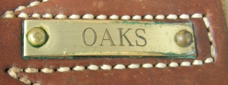 Top quality leather girth with removable sheepskin. Leather in a warm cognac color combined with plush natural sheepskin provides comfort for your horse & style for you. Easy to clean, this girth is ideal for use in the show ring or in the schooling ring. Extra sheepskin liners allow you to keep a clean girth on hand at all times! Triple layer elastic one 1 end, split end on other & roller buckles at both ends, with fancy white contrast stitching. Stamped size 50, it measures 52" x approx 3" at widest point. Small brass plate on end by elastic that says "Oaks". Elastic looks in good condition, leather is supple & in excellent condition & sheepskin liner either has discolored areas(natural coloration) or needs to be cleaned & is slightly smaller than velcro area as there is about 1" of velcro visible on each end. Brand unknown, but similar to ones made by Beval, Perri's Leather, Edgewood, etc