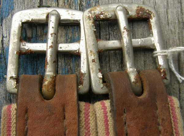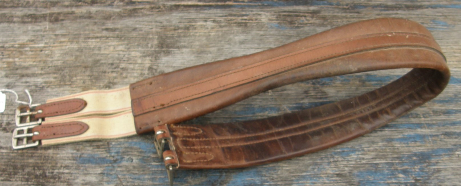 Made of shaped & padded leather with a reinforcing leather overlay, & elastic at one end. Measures approx 3" at widest point on belly. Brand unknown. Stamped 44, it measures 45 1/2" so has stretched slightly. Some wear marks but leather is supple.
