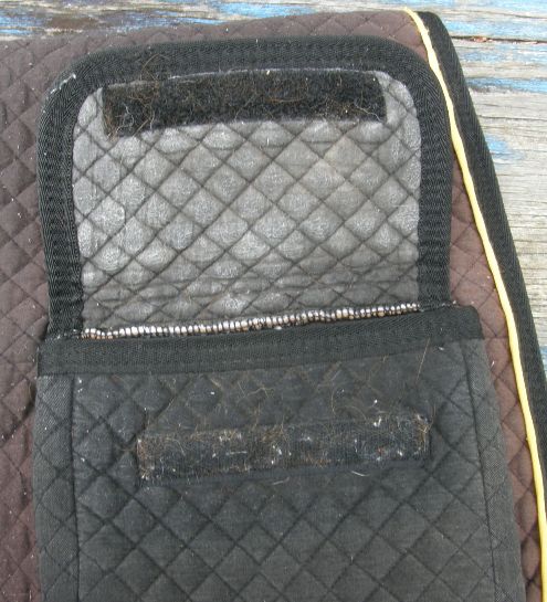 Half fleece lined quilted English saddle pad with pockets or bags in rear for carrying beverages, food, or accessories. 5/8" quilted squares, has velcro billet straps, nylon girth guide & 8" x 8" x 1 1/2" pockets, 1 on each side with velcro closures/no buckles to fiddle with. Pad measures approx 24\rdblquote at spine with a 19\rdblquote drop. Great for trail riding with an English or Australian Saddle. Clean, minor hair in fleece, some fuzzies to top side from washing due to fleece lining, & some small frayed areas to gold piping.