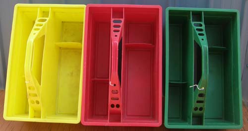Molded polymer plastic. Heavy duty for all your grooming needs. 4 compartments, slots in handle for small items, holes for hoof picks, holds many items! No cracks or breaks, minor dirt in bottom, owners name written in black sharpie on 1 end(is written larger on pink tote), otherwise excellent like new condition. Sticker from manufacturer on side. Not limited to use with Equines, can be used to hold many items.