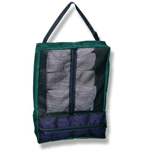Organize your bandages, leg wraps, cottons, quilts, etc in this handy hanging bag. This Bandage Bag is great for storing bandages, polos, leg wraps, etc. Mesh screen discourages growth of mildew and mold. 2 separate compartments, larger one great for quilts, cottons or shipping boots, smaller one on bottom great for polos, wraps & bell boots. Nylon strap with snap makes it easy to carry or hang anywhere: stall front, tack room or trailer door. Great for wraps & bandages neat & handy. Measures approx 18" W x 25" H x 5" D. Light dust from hanging around, but otherwise looks like new.