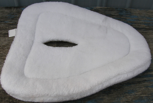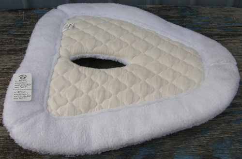The classic style half pad has a quilted cotton top with real sheepskin fleece rolled edges, slot and underside. This half pad provides lift where it's needed. There is a cut out hole 6" long to allow for the high withered horse & no rolled edge under the rider's leg to give closer contact with your animal and less bulk under the leg. Velcro billet straps for easy on/off. Pad is soft & comfortable, breathable & light, temperature balancing, draws away excess heat & moisture, easy to care for & hard wearing. Pad measures approx 20 1/2" long at spine & 18" at widest point. Clean & in excellent used condition with only minor stains to quilted top, but at some point may have been washed with a red or pink pad as fleece only has a pink cast to it, not the quilted top. POssible it was made this way, but don;t know for sure.