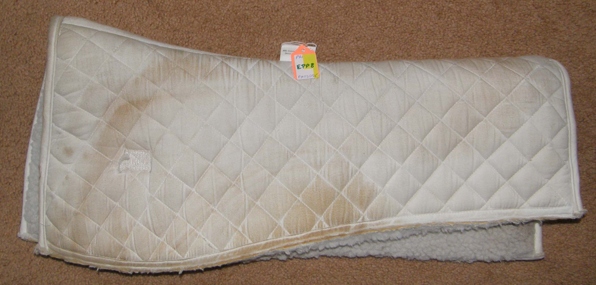 Double back padded dressage pad with fleece lining. Great impact absorption & back protection. This pad is supposed to have quilted cotton sides, but previous owner cut them off, so all that is left is the fleece lined, padded quilted top. Great to use as a back pad under a Dressage saddle or other English saddle. Raised front for wither relief. Pad is approx 1” thick & measures 23 ½” back seam x 22” wide.