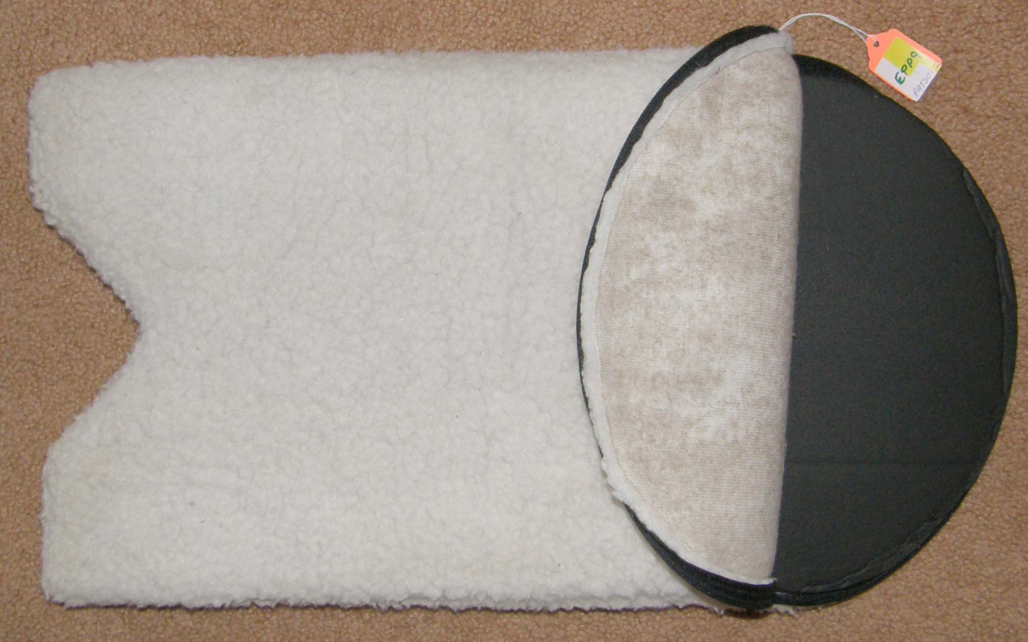 The keyhole seat riser pad is used on certain saddles when wish to be seated more forward. Recommended for some flat jumping saddles where padding is low in back. Also great on sway backed or older horses. Has removable fleece cover with Velcro closure that is washable. Measures approx 19 1/2" at longest point. Has some reddish marks that should wash out(see photo). Brand unknown.