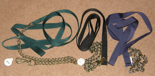 Single ply 1” wide sturdy thick black or very dark brown leather lead with approx 30” chain. Measures approx 8 1/2' long overall. Leather sturdy yet flexible & chain has some rust so not nice enough for shows, but snap works fine. Great for handling studs or young stock, or use at small shows. Brand unknown.