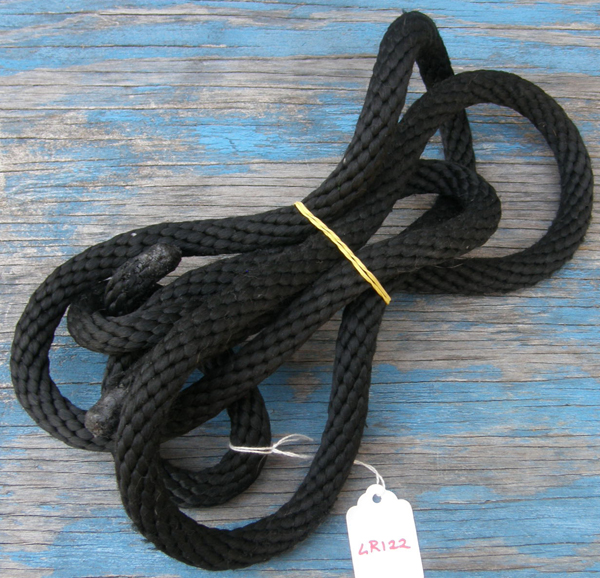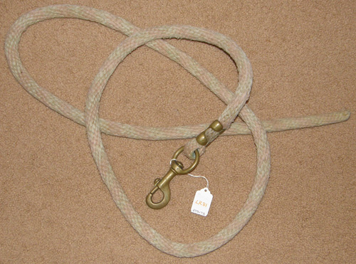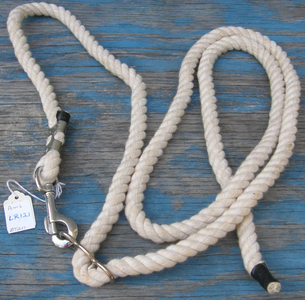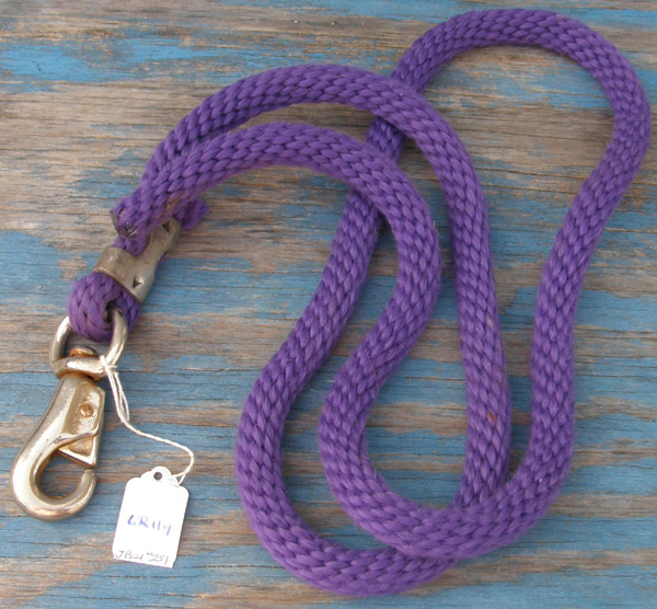 Thick poly lead rope with solid brass bolt snap. 3/4" x 7 1/2' long. This is heavy duty, thick & comfy for your hands. Well used with minor dirt but snap works well. Brand unknown.