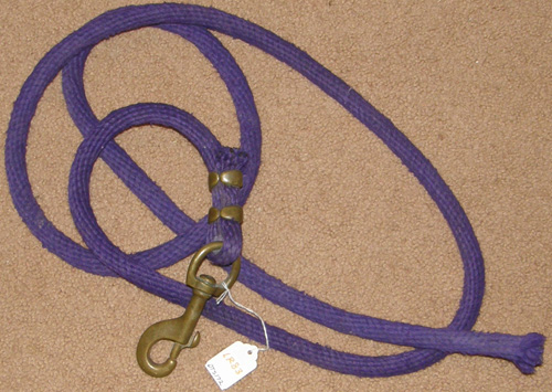 5/8” cotton lead with neck rope fitting & bolt snap. Rope weaves in & out of 2 holes with the snap hooking back to the 3rd hole. Almost 8 1/2' long total length, will be shorter when hooked around neck. Very adjustable & great for tying the horse that likes to pull back.