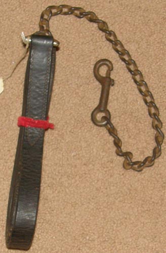 Single ply 1” wide brown leather lead with approx 24” chain. Measures approx 9' long overall. Leather flexible & only surface cracks when tightly bent, but is not nice enough for shows. Coating is gone from most of the chain/snap, so looks rusty, but snap works fine. Great for handling studs or young stock. Brand unknown.