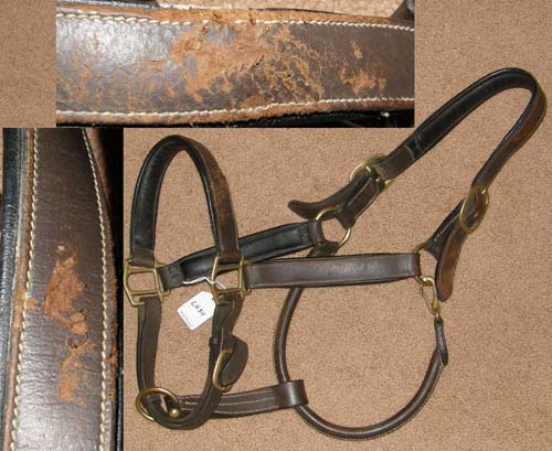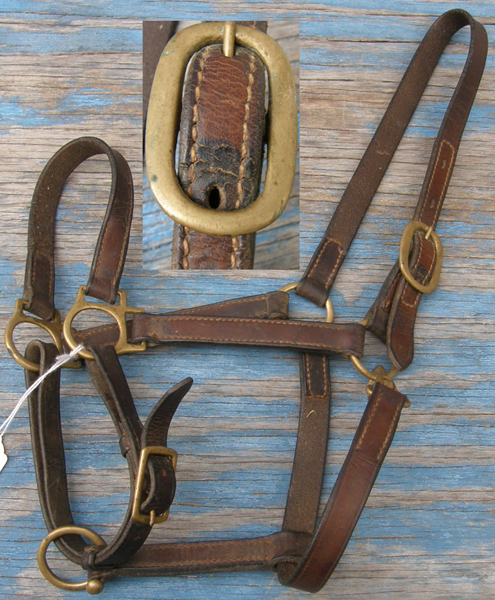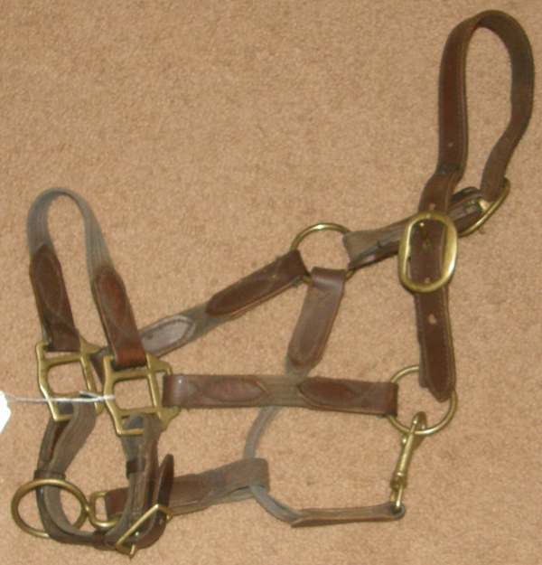 Good quality 3/4” single ply leather halter with doubled & stitched leather cheeks, single buckle crown, adjustable chin, brass hardware, spring snap at throat, & reinforced in area of holes on crown piece. Cheeks measure approx 6" not including hardware. Left cheek piece & end of crown piece was chewed on by a pasture mate leaving a rough surface, a small gouge on chin piece making a weak spot, otherwise leather is supple. Brand unknown.