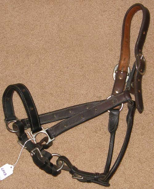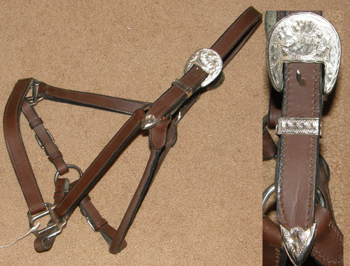 Good quality 1” doubled & stitched leather halter with staianless steel hardware. Double buckle crown with etched "silver" buckles, keepers & tips, rolled & wired throat, & 3 way adjustable under chin. New, no tags & unmarked as to maker, so brand unknown. Cheeks measure 8 1/2" not including rings & measures approx 43" from ring to ring over crown on middle hole on each side. Use as a fancy stable, track or sale halter, or add silver trim to use as an extry level show halter. Matches leather lead with chain SL33. Silver buckle & keeper on 1 side have darkened a bit & don't know if "silver" will clean up all the way.