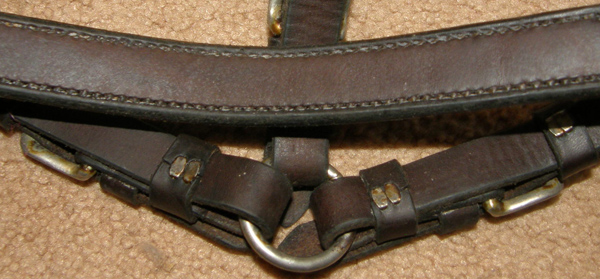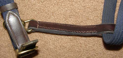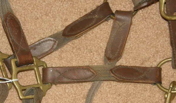 1” cotton webbing with leather accents and solid brass fittings. Adjustable under chin, snap at throat & double buckle crown. Some dirt, otherwise excellent used condition. Cheek measures approx 8” not including hardware. Safety crown missing, so we made 1 out of a good quality used stirrup leather, so there are holes punched across entire crown & it has a brand new leather strap connecting chin to throat made by our Amish repair man(see inset). Brand unknown, but it is a very nice, excellent quality halter with supple leather.