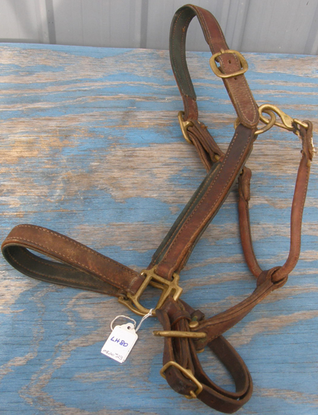 3/4” doubled & stitched soft quality leather halter with rubbed & darkened edges, & solid brass hardware. Double buckle crown & adjustable chin, rolled throat with snaps on both sides, so great for grooming halter. Use as stable, track or sale halter for your quality horse. Cheeks measure 8" not including hardware, with overall 41" smallest & 46 1/2" largest adjustment. Excellent used condition, small light spot of white paint, looks like horse rubbed head on a painted surface. Brand unknown, but excellent quality.