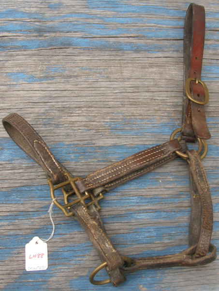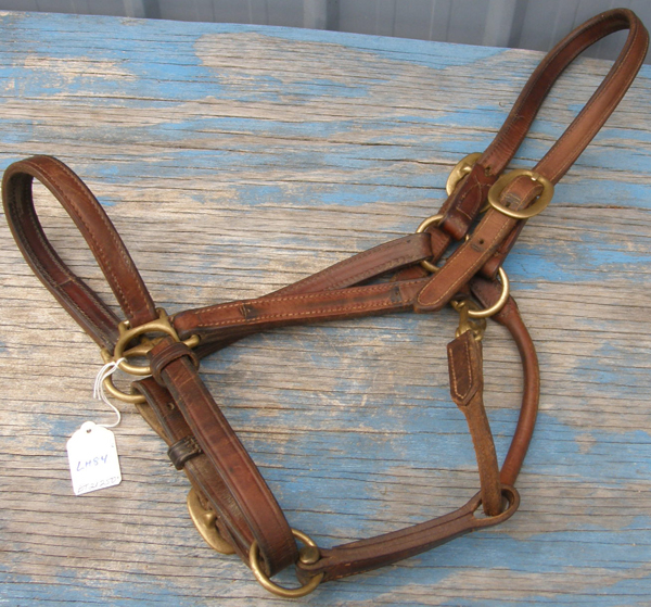 Quality 1” doubled & stitched leather halter with mostly solid brass hardware. Single buckle crown, adjustable chin, & throat snap. Measures 44" ring to ring over crown on middle adjustment with 8" cheeks. Excellent used condition, leather is butter soft, with light wear from buckle on crown piece. Brand unknown. Use as stable, track or sale halter for your quality horse.