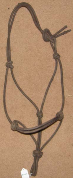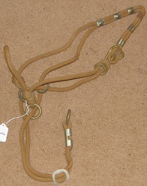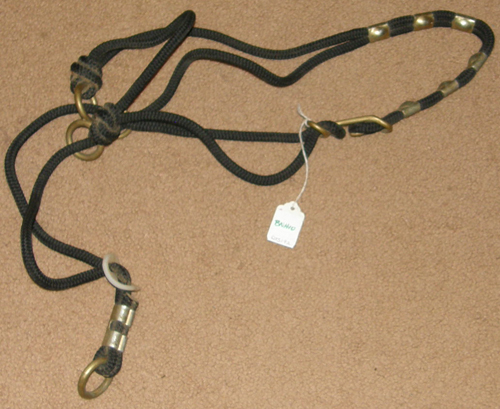The halter for complete control every time you handle a horse. When the animal resists, the halter tightens and pressure is applied to nerve areas on the head. When the horse relaxes, pressure is immediately relieved, providing instant reward. All hardware on the Be Nice Halter is solid bronze, except for clamp. Great training halter. Some light dirt mainly from sitting in a barn. Measures 36" from knot on side of nose over the crown & to knot on other side, so use on Arabians, large ponies, or very small headed horses. Company is no longer in business.
