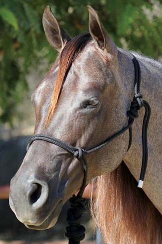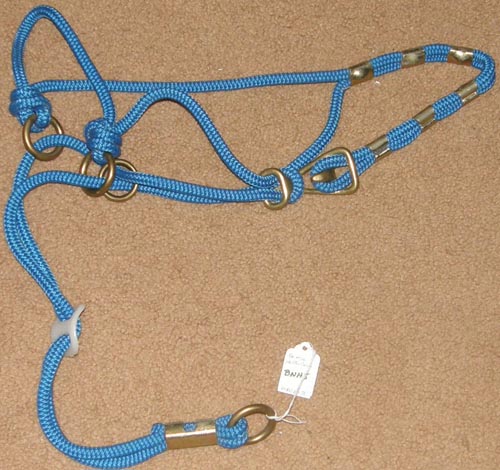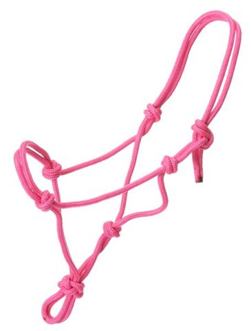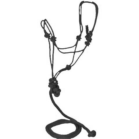 Poly nylon rope halter with double rope noseband, copper tip on end of halter crown to prevent raveling/loose ends. Narrow base at the head and nose allows for more precise control. The knots in this halter apply pressure to the delicate nerve endings on the head & should be used with caution. Comes with removable 5/8" poly lead. Fits Average Horse size (800 - 1100 lb).