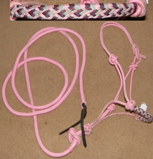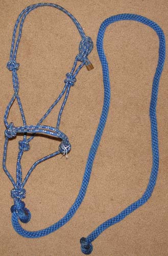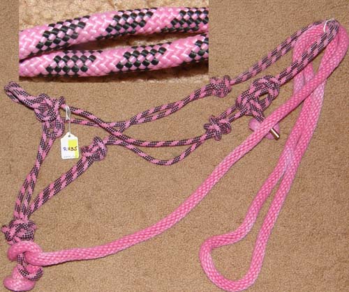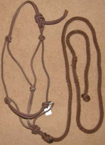 Poly nylon rope halter with attached(detachable) 5/8” poly rope lead almost 7' long, copper metal tip on end of halter crown to prevent raveling/loose ends. New, but lead rope faded in spots from being on display in store window.