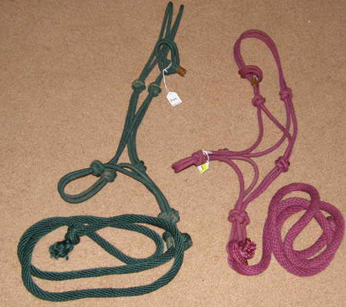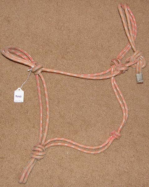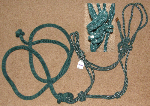 Poly nylon rope halter with double rope noseband, metal tip on end of halter crown to prevent raveling/loose ends. The knots in this halter apply pressure to the delicate nerve endings on the head & should be used with caution. Fits Average Horse size (800 - 1100 lb). New, minor dirt/dust on knots from store handling/storage.