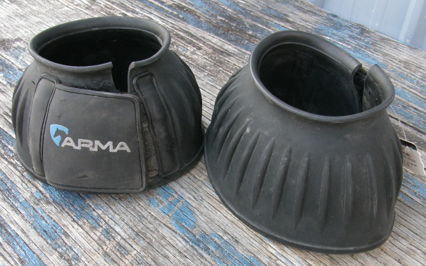 Designed for overreach protection, these bell boots have double-locking Velcro closures hold the boot securely in place. Tagged size Medium, they measure 3 1/2" tall with approx 3" opening. Missing bottom velcro outer flap on both boots, lots of dirt stains & a few small cuts. Great as spares or for turnout.