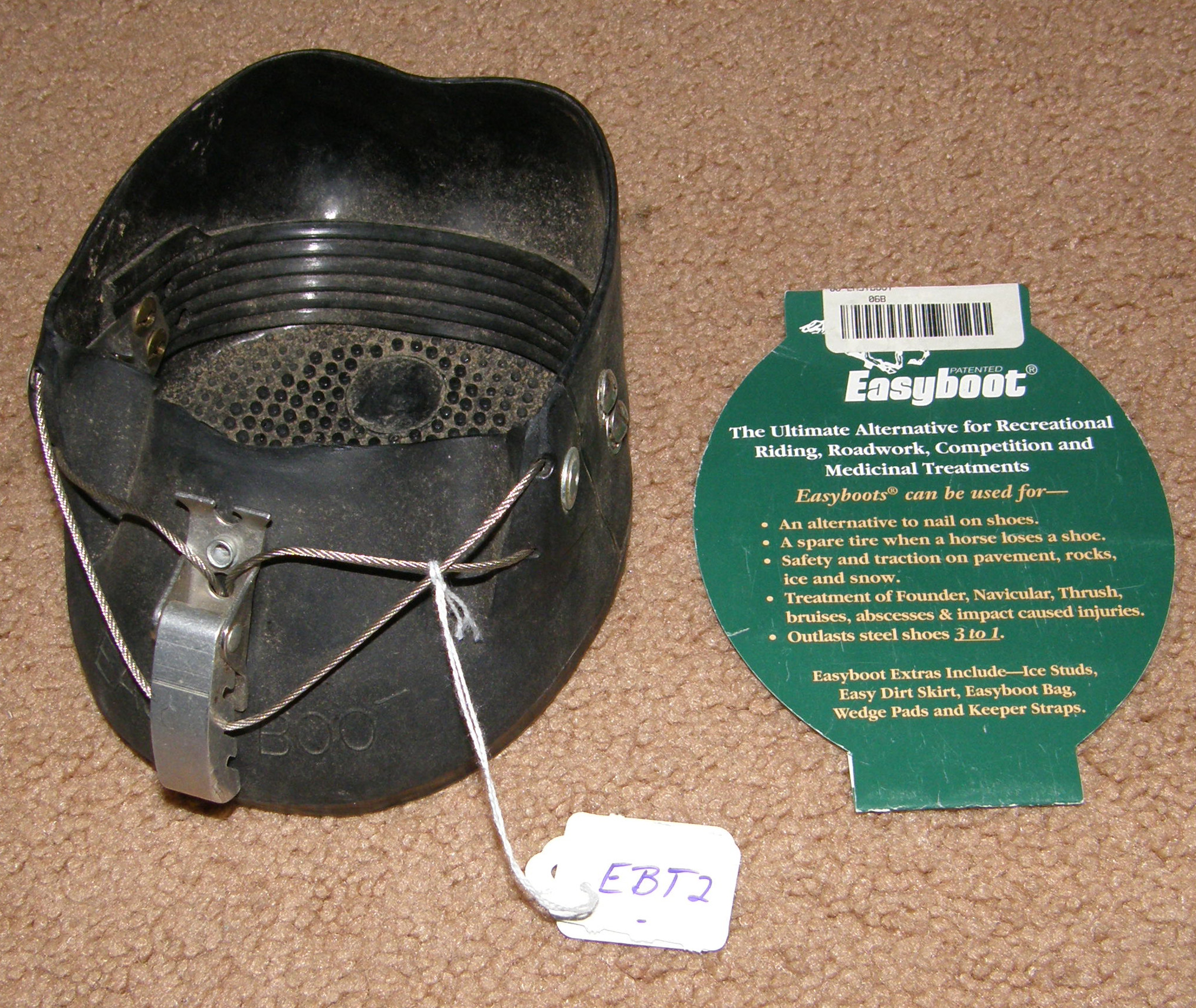 The Barrier Boot is a replacement for a lost shoe and protects the tender frog and sole. It allows the horse to walk unshod, protecting the hoof from cracks and chips. The Barrier Boot is ideal for trail riding with tender soled horses. The simple pull-on fit allows for easy application in the field without tools. The Barrier Boot stays secure with a strong nylon adjustable strap without damaging the hoof wall. Also works for horses that have to walk on slick or finished surfaces, such as visits to schools, nursing homes, etc. The boot holds medications and conditioning oils, allowing for continuous soaking of the foot. The boot can be removed for inspection or medication. Medication or oil can be simply poured inside the boot for continuous soaking. Excellent used condition with no major signs of wear, minor dirt. Measurement is actual bottom of boot. Sold singly, 1 available.