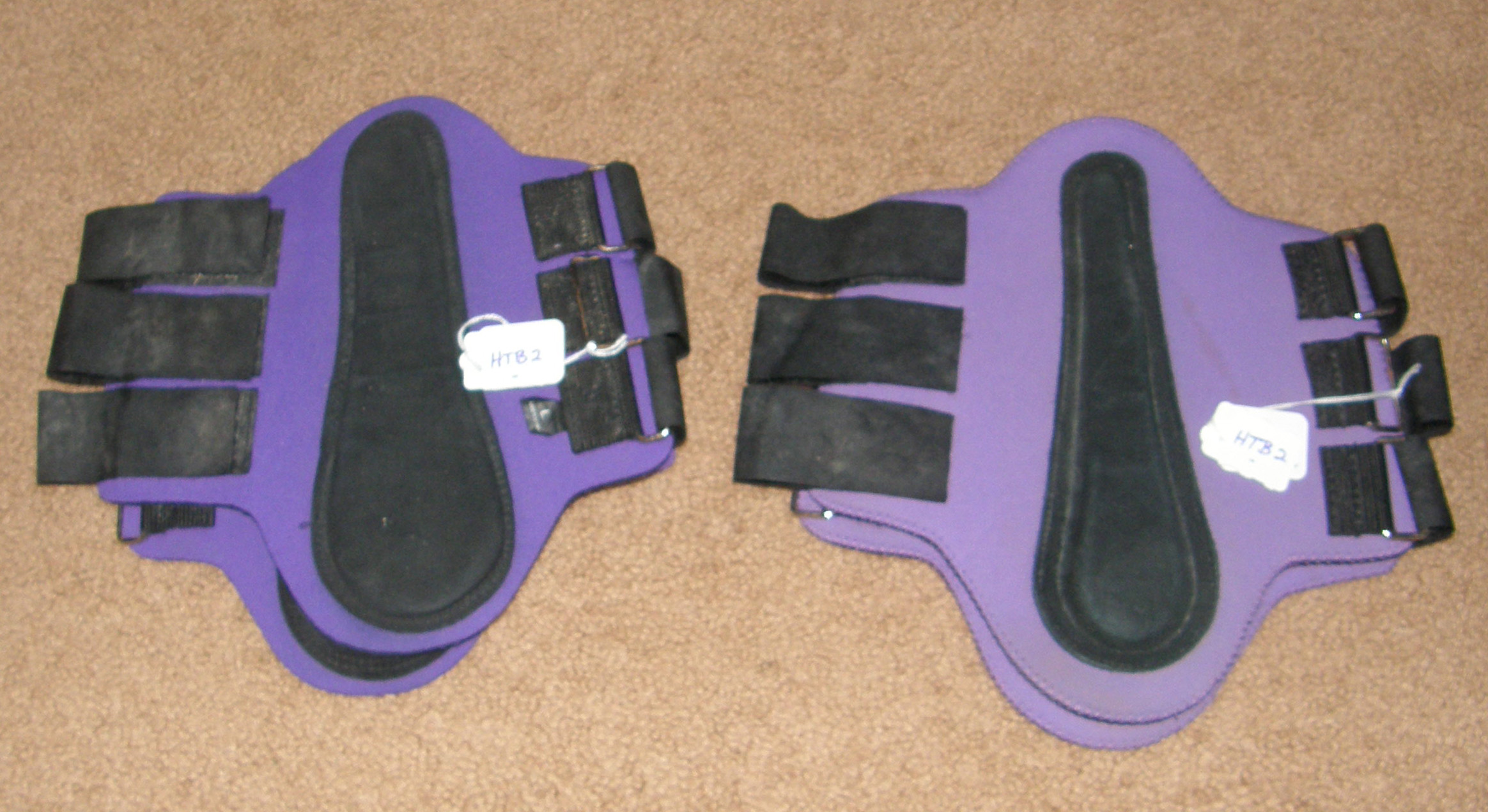 Protects splint/tendon area of front legs. Neoprene with 3 Velcro closure & padded suede teardrop shaped strike pad. Clean, minor dirt stains to inside & minor rust on hardware. Tagged size Large, the Lavender measures 10 1/2" tall x 9 1/2" wide. Brand unknown.