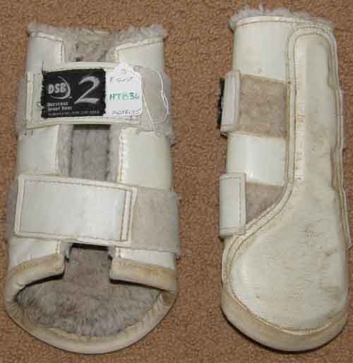 Rubber with 2 wide Velcro closure. Protects splint/tendon area of front legs. Tagged size Medium, they measure 9 5/8" tall x 8 1/4" wide. Some dirt stains.