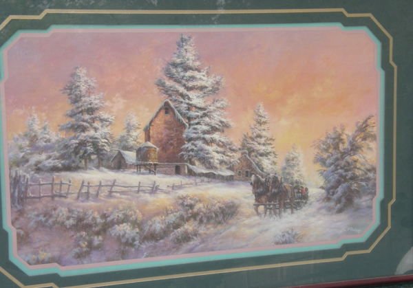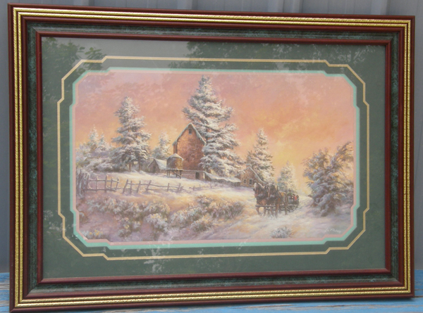 Framed & matted print by Lee K Parkinson showing a team of Belgian draft horses pulling a sled past an Amish farm house & trees all covered in a blanket of snow. Measures 24 1/4" wide x 17 1/4" high with dark burgundy wood frame with gold accents & teal swirl inlay, hunter green mat with pink & green inner detailing, gold accent, & print itself measures 16 3/4" wide x 9 3/4" high. Comes with glass, paper backing, & bracket in back for hanging. Print has signature Lee K Parkinson on bottom right corner & believe title of print is Almost Home. Looks like new.
