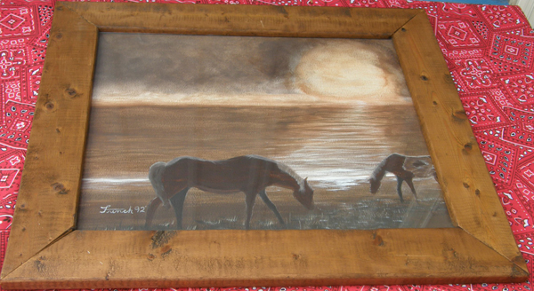 This framed artwork is of a Chincoteague or Assateague VA pony grazing the marshes with a sunrise or sunset over water & looks to be done in pastels or colored pencils. Image itself is 15 3/4” wide x 12 3/4” high, & is framed inside a barnwood look wood frame & comes with glass. Frame measures 20 3/4” wide x 17 1/2” high, is backed with a thin wood, & has small bracket attached on back for hanging. Artist is signed only as French '92. Lovely addition to collectors of Chincoteague/Assateague pony items, or horse prints. Excellent condition with only a few dings to frame.