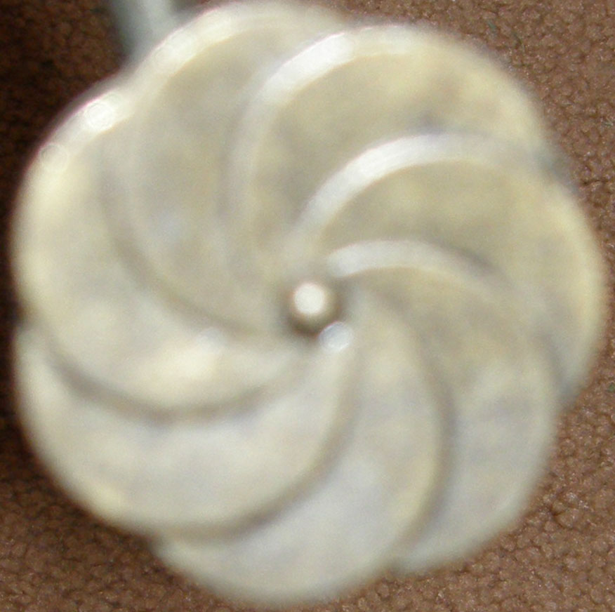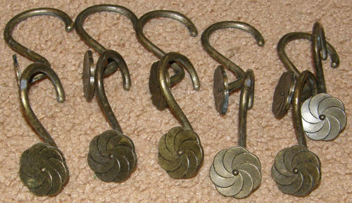 Set of 11 brass look metal shower curtain hangers or hooks with 1" diameter flower design. Metal similar to old "pot metal", but type of metal is unknown. Possibly vintage.