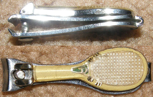 Vintage glossy enamel tennis racket top on metal nail clippers. Stamped Japan. Measures 3 3/4" long.